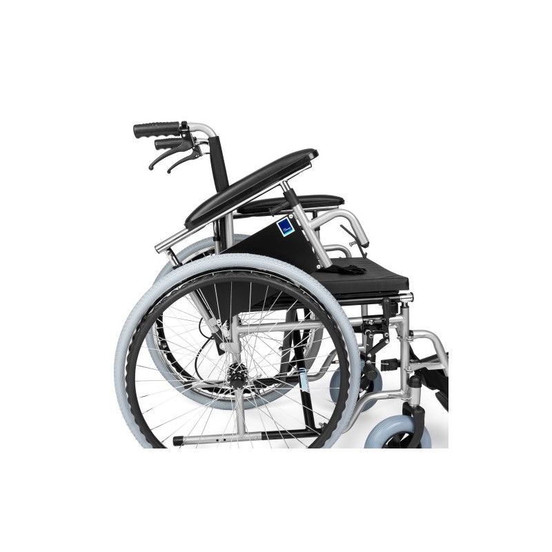 Został wyposażony w składane oparcie, anatomicznie wyprofilowaną ramę siedziska, odchylane podłokietniki i regulowane podnóżki. Wykonany z oddychającej i przepuszczającej powietrze tkaniny AEGIS, która dodatkowo zapobiega gromadzeniu się szkodliwych mikroorganizmów na jej powierzchni.